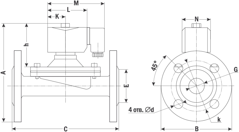 Клапан соленоидный нормально закрытый фланцевый прямого действия с диафрагмой для управления потоком рабочей среды в трубопроводе