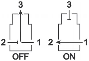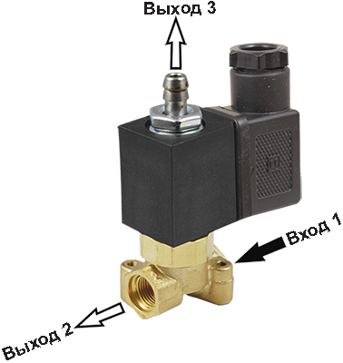 В случае отсутствия питания на катушке открыт путь 1 → 3, при подаче питания открыт путь 1 → 2.
