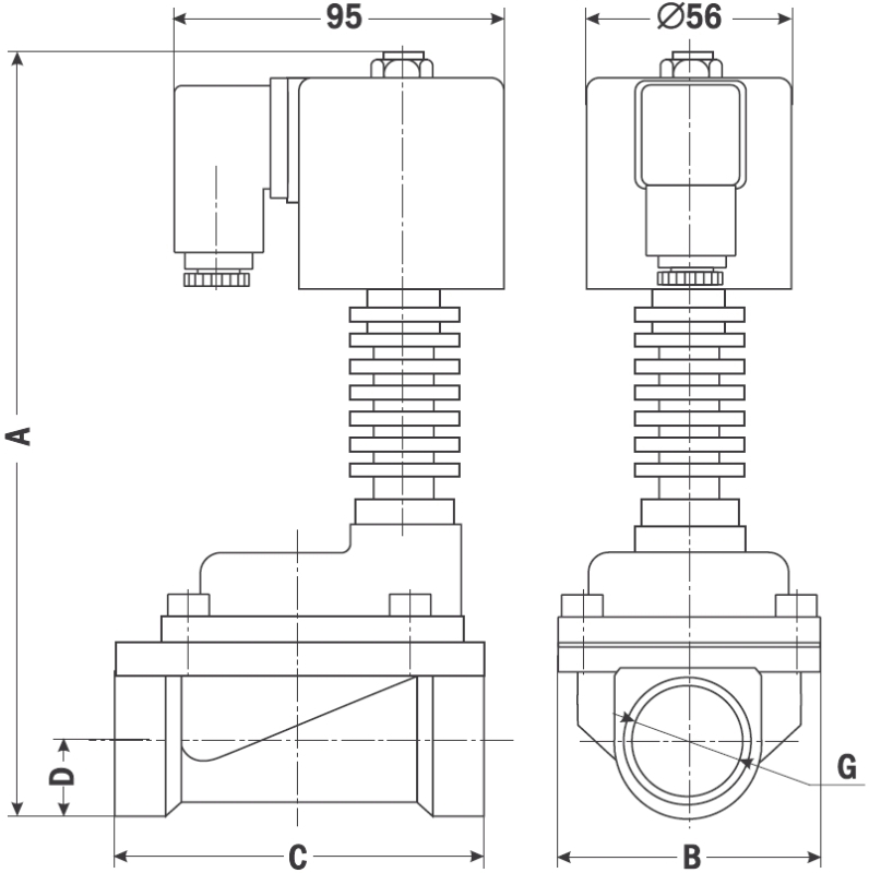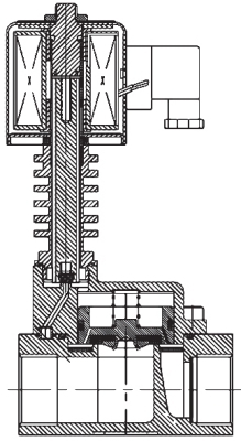 Клапан соленоидный нормально закрытый непрямого действия с поршнем для управления потоком рабочей среды в трубопроводе