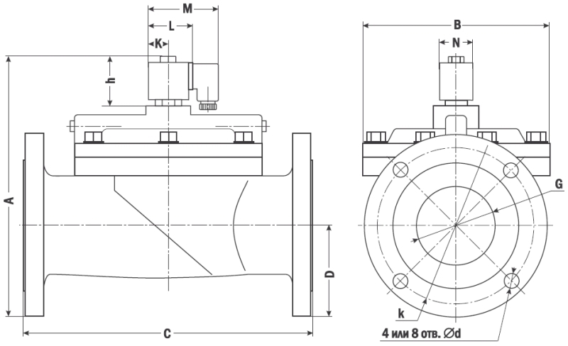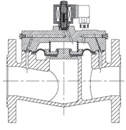 Клапан соленоидный нормально открытый фланцевый непрямого действия с диафрагмой для управления потоком рабочей среды в трубопроводе