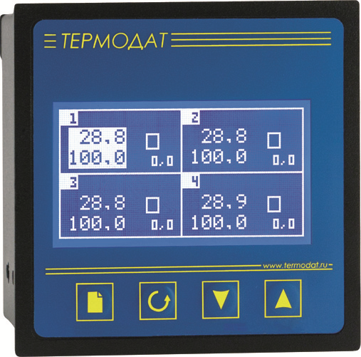 Термодат-17М5 — четырехканальный измеритель температуры, аварийный сигнализатор и позиционный регулятор с графическим 3,5″ дисплеем. Электронный самописец. Прибор имеет универсальный вход, предназначенный для подключения термопар или термосопротивлений, а также датчиков с токовым выходом. Разрешение 1°С или 0,1°С задается пользователем. Может управлять как нагревателем, так и охладителем. Интуитивно понятное управление обеспечивается 4 кнопками внизу экрана.
