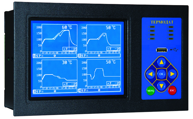 Термодат-19Е5 — четырехканальный программный ПИД-регулятор температуры и электронный самописец с графическим 6″ дисплеем. Прибор оснащен USB-разъемом для снятия архивных данных на Flash-носитель. Прибор имеет универсальный вход, предназначенный для подключения термопар или термосопротивлений, а также датчиков с токовым выходом. Разрешение 1°С или 0,1°С задается пользователем. Может управлять как нагревателем, так и охладителем. Интуитивно понятное управление обеспечивается 7 кнопками справа от экрана.