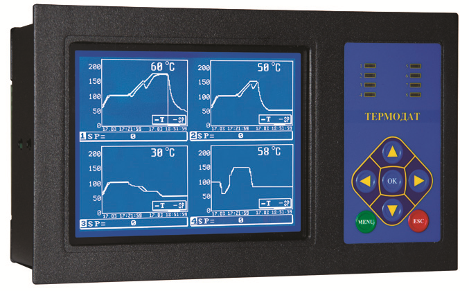 Термодат-19М4 — четырехканальный измеритель температуры, аварийный сигнализатор и позиционный регулятор с графическим 6″ дисплеем. Электронный самописец. Прибор имеет универсальный вход, предназначенный для подключения термопар или термосопротивлений, а также датчиков с токовым выходом. Разрешение 1°С или 0,1°С задается пользователем. Может управлять как нагревателем, так и охладителем. Интуитивно понятное управление обеспечивается 7 кнопками справа от экрана.