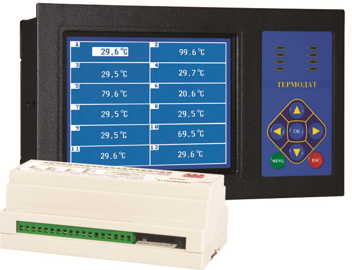 Термодат-29К4 — многоканальный ПИД-регулятор температуры и электронный самописец с графическим 6″ дисплеем. Прибор имеет от 8 до 12 универсальных входов, предназначенных для подключения термопар или термосопротивлений, а также датчиков с токовым выходом. Разрешение 1°С или 0,1°С задается пользователем. Может управлять как нагревателем, так и охладителем. Интуитивно понятное управление обеспечивается 7 кнопками справа от экрана.