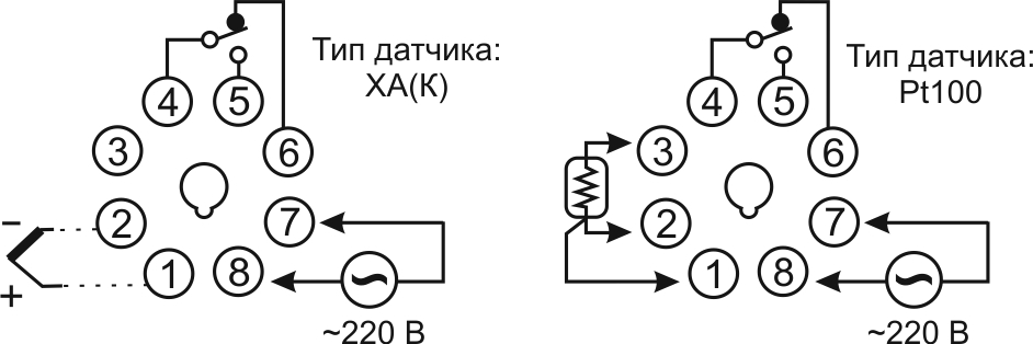 - В зависимости от модификации прибора в качестве датчика температуры используется термопара ХА(К) или Pt100 (в комплект не входит)