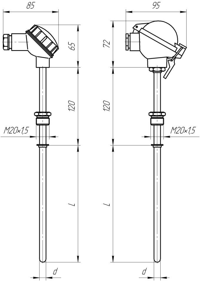- ТСМв/ТСПв-1088-02: защитная арматура с подвижным штуцером М20×1,5; материал клеммной головки – фенопласт