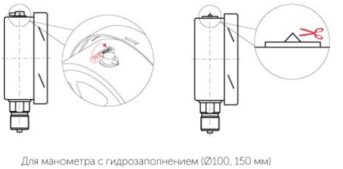 Для манометров с возможностью гидрозаполнения после монтажа необходимо срезать специальный выступ на пробке прибора. Для пробок с клапаном или краником — открыть клапан или краник.