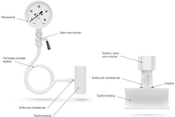 Типовой узел отбора для подключения манометра состоит из приварной бобышки с площадкой под уплотнительную прокладку, петлевой трубки, трехходового крана или игольчатого клапана. В качестве уплотнения в резьбовых соединениях между приварной бобышкой, краном и манометром рекомендуется применять паронитовую, фторопластовую или медную прокладку.