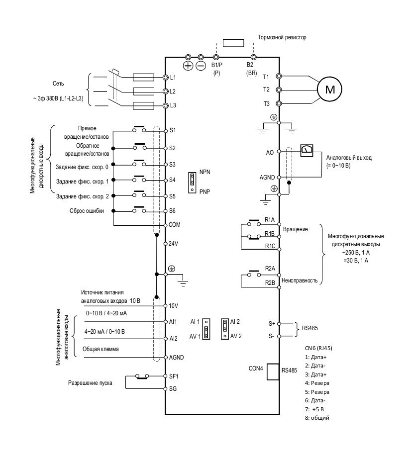 Задание частоты | Кнопки/потенциометр пульта управления Аналоговые входы AI1, AI2 (0/2~10В, 0/4~20 мА) Дискретные входы БОЛЬШЕ/МЕНЬШЕ Линия интерфейсной связи |
