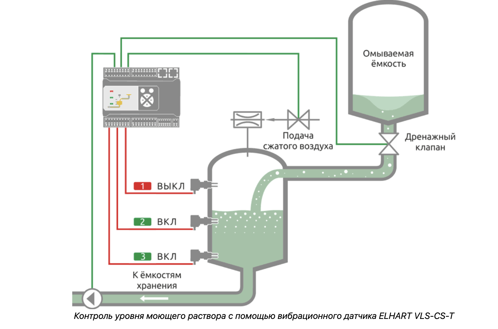 Решением данной проблемы является использование вакуумной системы возврата жидкостей. Где под действием втягивающей силы, создаваемой эжекционным воздушным генератором вакуума, моющий раствор поступает в вакуумный бак. За счет того, что жидкость поступает сверху, а снизу бака ее откачивает возвратный насос, исключается попадание воздуха в патрубок насоса. На данном этапе важно контролировать уровень в баке — слишком высокий уровень приводит к попаданию в пневматическую систему моющей жидкости, слишком низкий уровень возвращает проблему попадания воздуха в сливной патрубок возвратного насоса. Решением задачи контроля уровня является применение вибрационного сигнализатора уровня VLS-CS-T, устойчивого к воздействию температур или химически агрессивных моющих растворов и способного работать под действием вакуума: