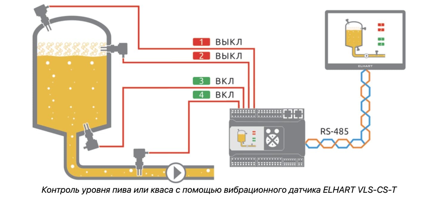 Работой клапанов и насосов управляет ПЛК, получая дискретные сигналы об уровнях от вибрационных датчиков VLS-CS-T.