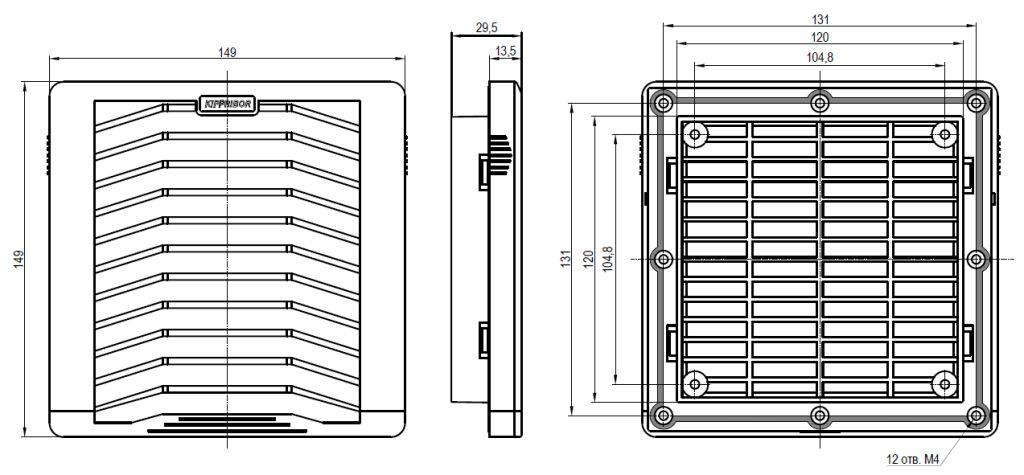Габаритные и установочные размеры впускных решеток с вентиляторами и выпускных решеток серии KIPVENT