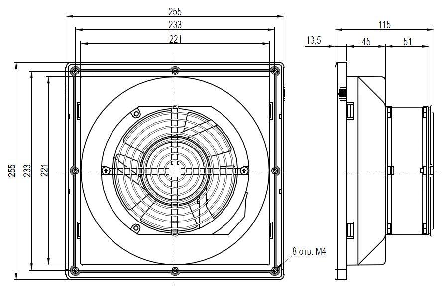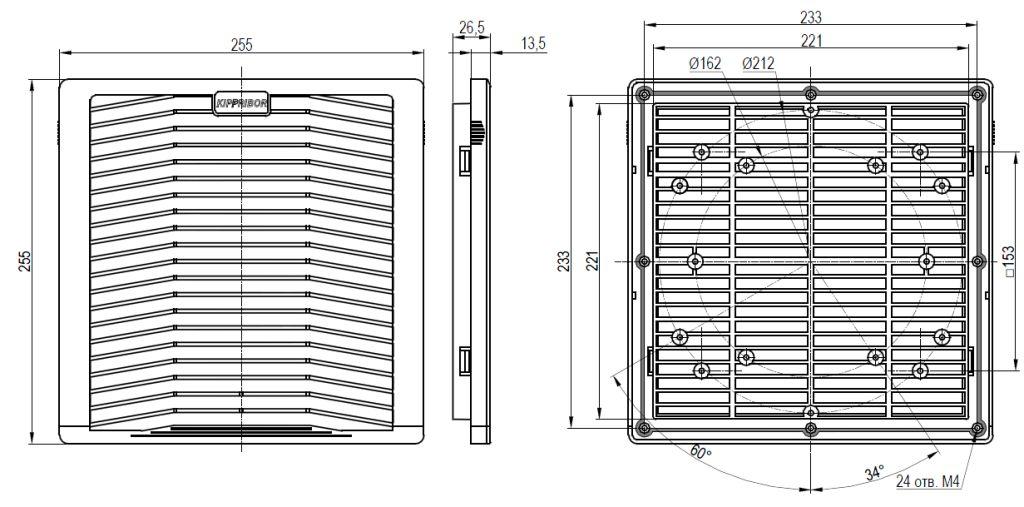 Габаритные размеры вентилятора KIPVENT-500.01.230 Габаритные размеры впускной решетки KIPVENT-500.01.300 Габаритные размеры выреза под установку решетки KIPVENT-500