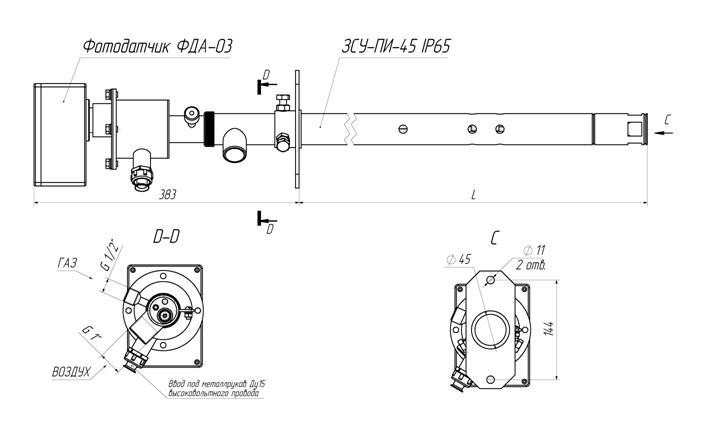 Для розжига горелок нефтехимических печей, работы в пилотном режиме, имеется встроенный электрод розжига и фотодатчик ФДА-03 для контроля собственного пламени.